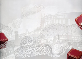 ジルダールギャラリー 2703号室のベッドと壁にアート作品を施します。